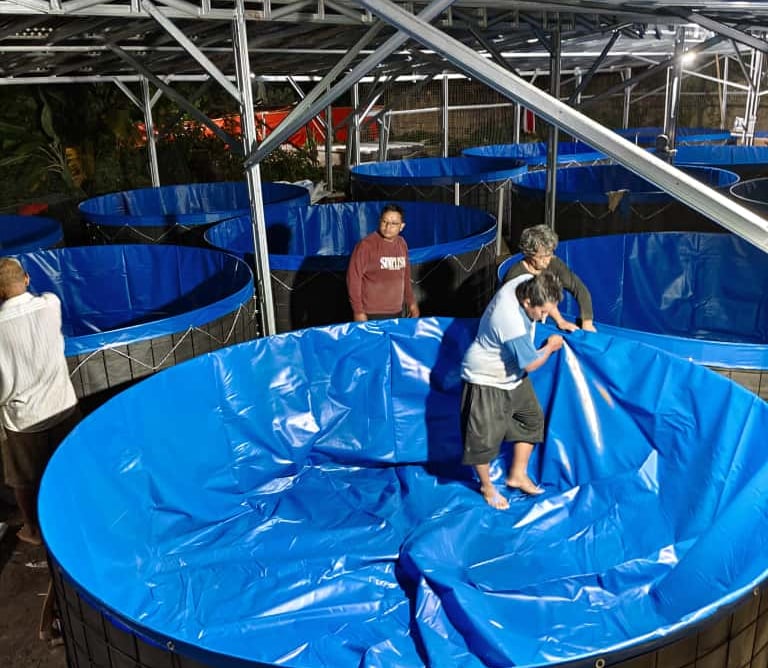 Untuk budidaya sistem bioflok, sangat disarankan menggunakan terpal dengan ketebalan yang cukup dan berbahan semi karet, karena material ini lebih lentur, tidak mudah retak, serta memiliki daya tahan tinggi terhadap tekanan air dan perubahan suhu.
